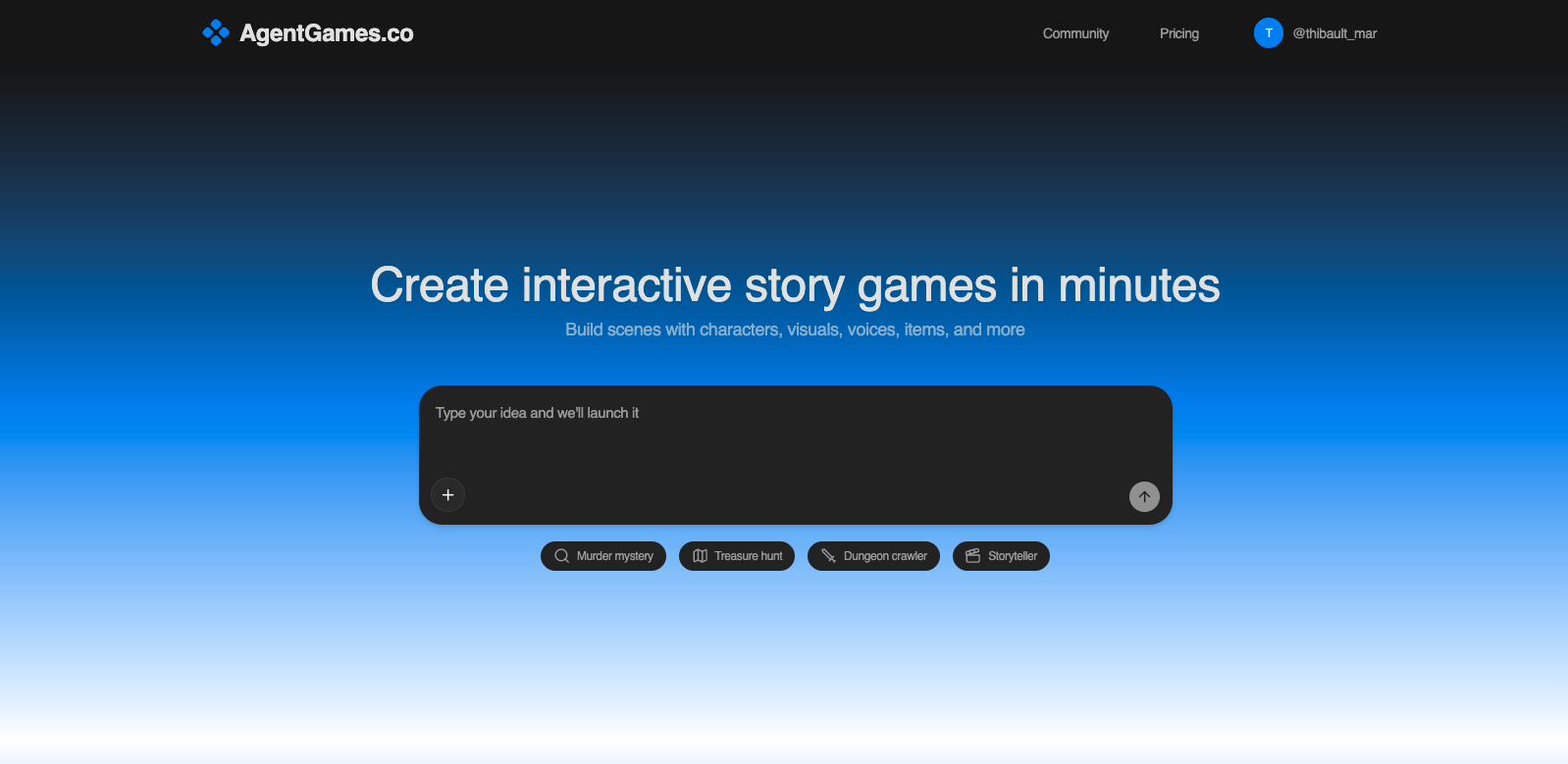 AgentGames.co is a platform that enables users to build interactive story games with AI in minutes. Users can type an idea to launch a game and build scenes with characters, visuals, voices, items, and more. The platform also features a community section to explore and play games created by other users.