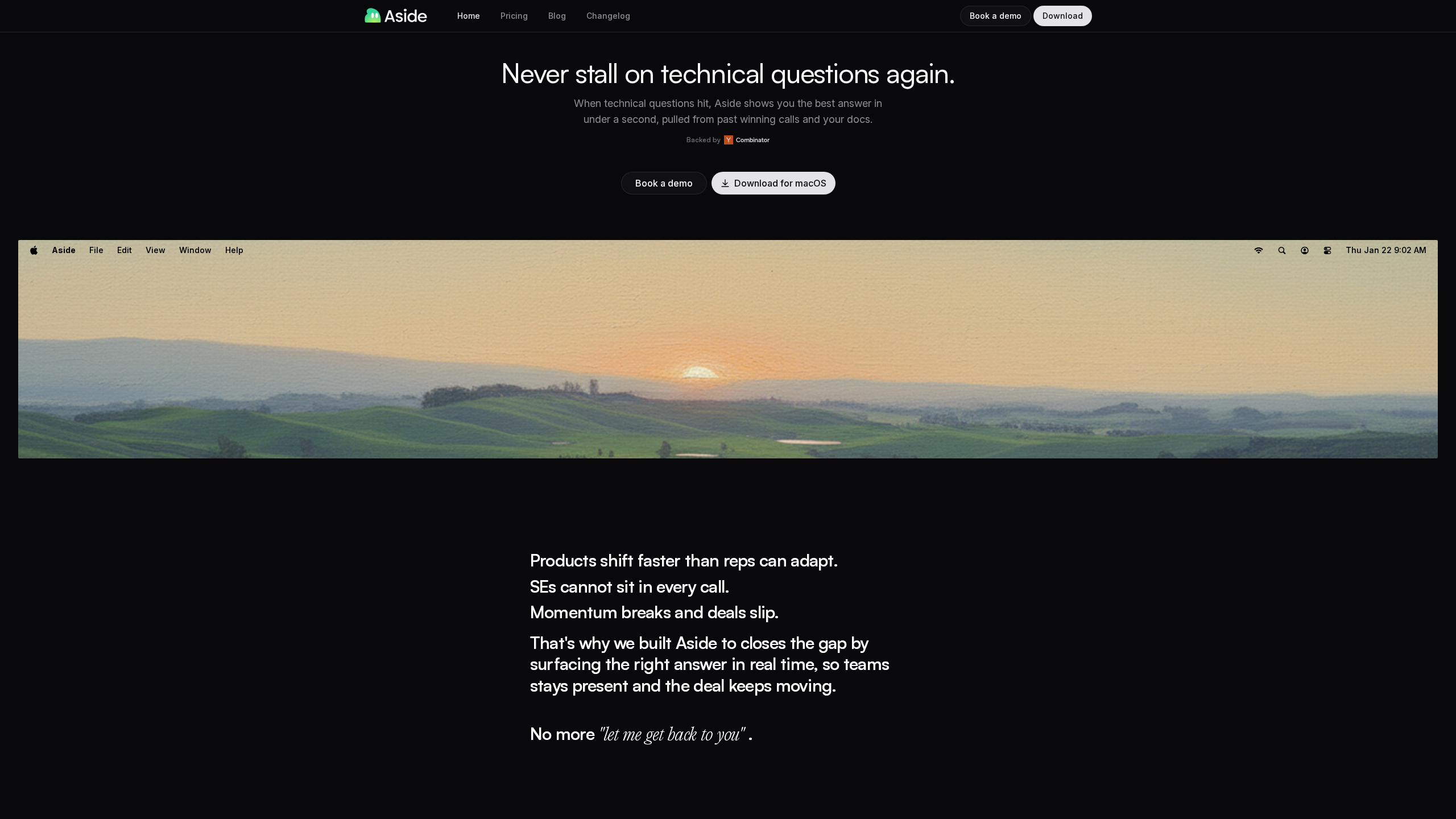 Aside is a tool designed to close the gap when technical questions arise during calls by surfacing the right answer in real time. It helps teams stay present and keep deals moving by providing answers from past winning calls and company documentation in under a second, eliminating the need to say "let me get back to you".
