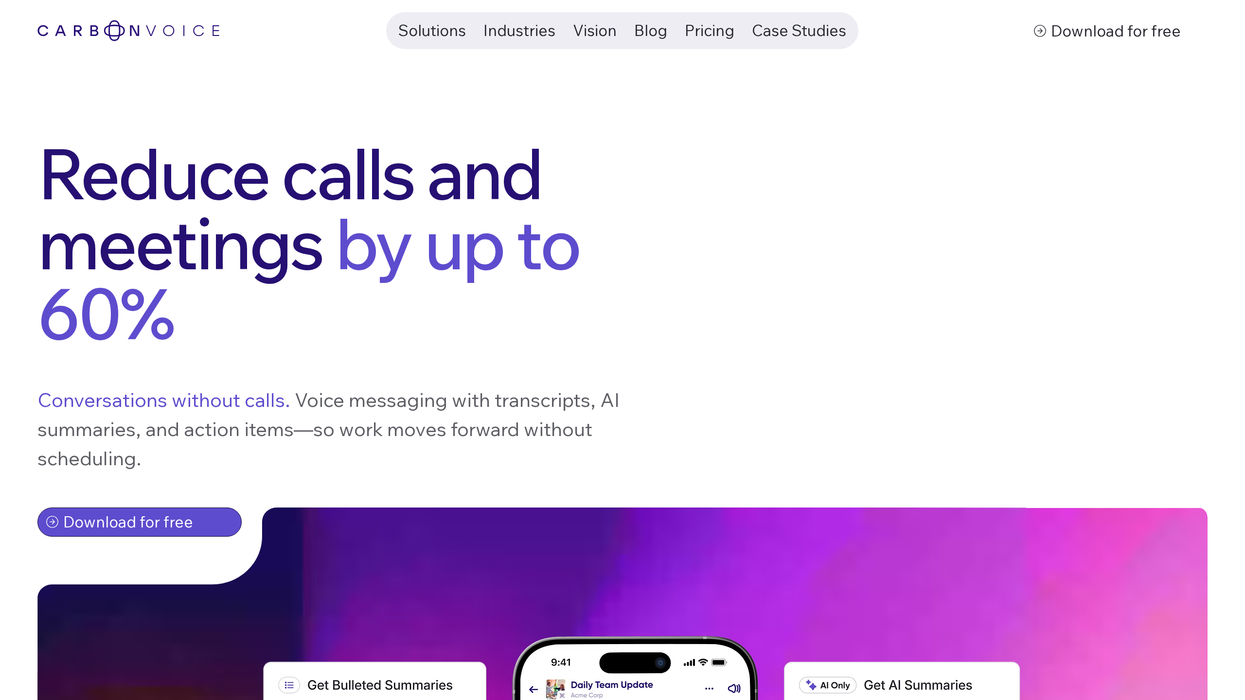 Carbon Voice is a voice messaging platform designed to reduce calls and meetings by up to 60%. It facilitates asynchronous conversations with features like automatic transcripts, AI-powered summaries, and action items, allowing work to progress without the need for scheduling. The platform is described as faster than calls and text messages, providing automatic AI notes for every conversation.