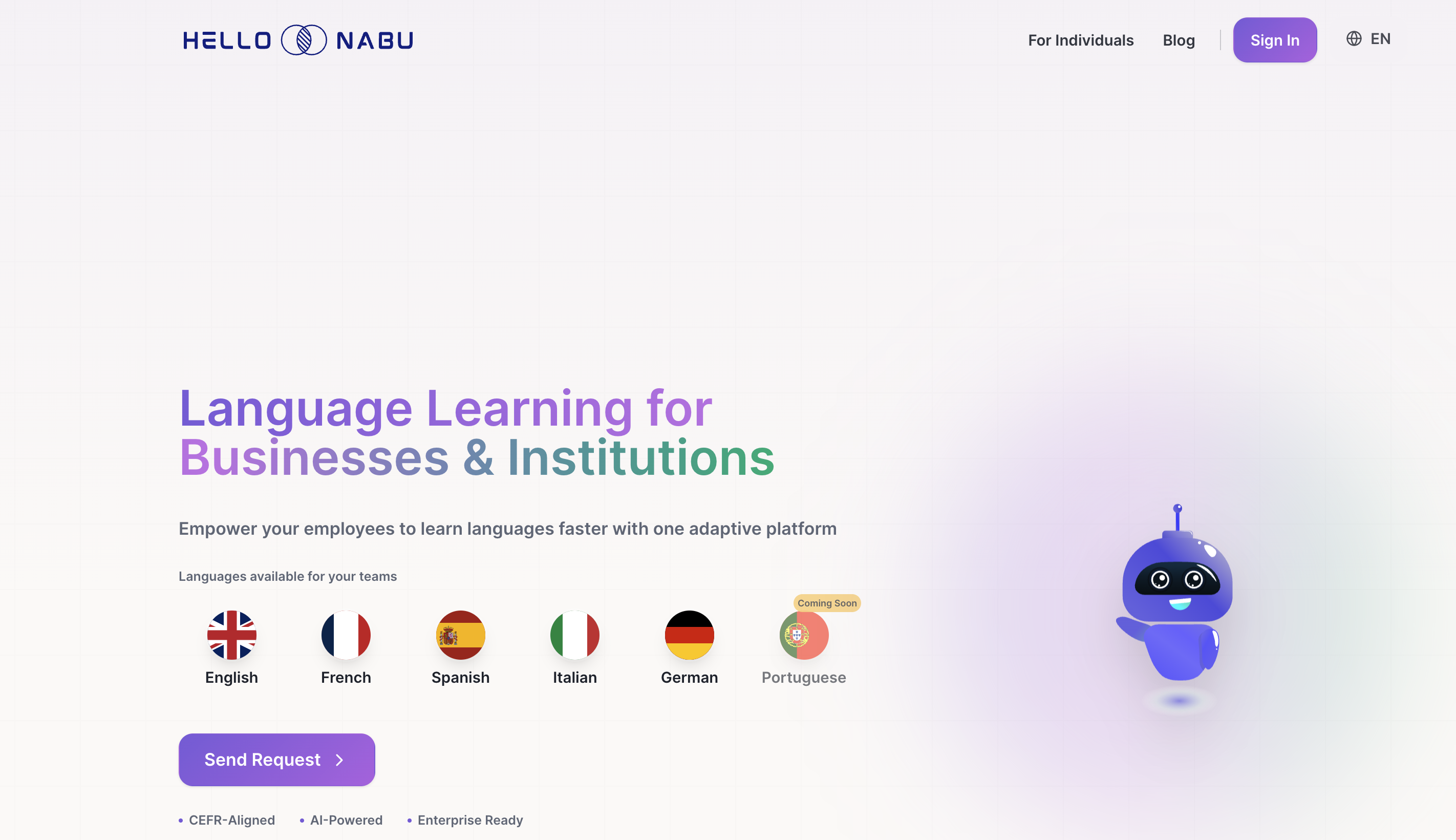Hello Nabu is an all-in-one language learning platform powered by AI, designed to help users reach their language goals faster and more effectively. With a personalized curriculum and an immersive storytelling approach, Hello Nabu makes mastering a new language engaging and attainable. A free trial is available to start with no credit card required.