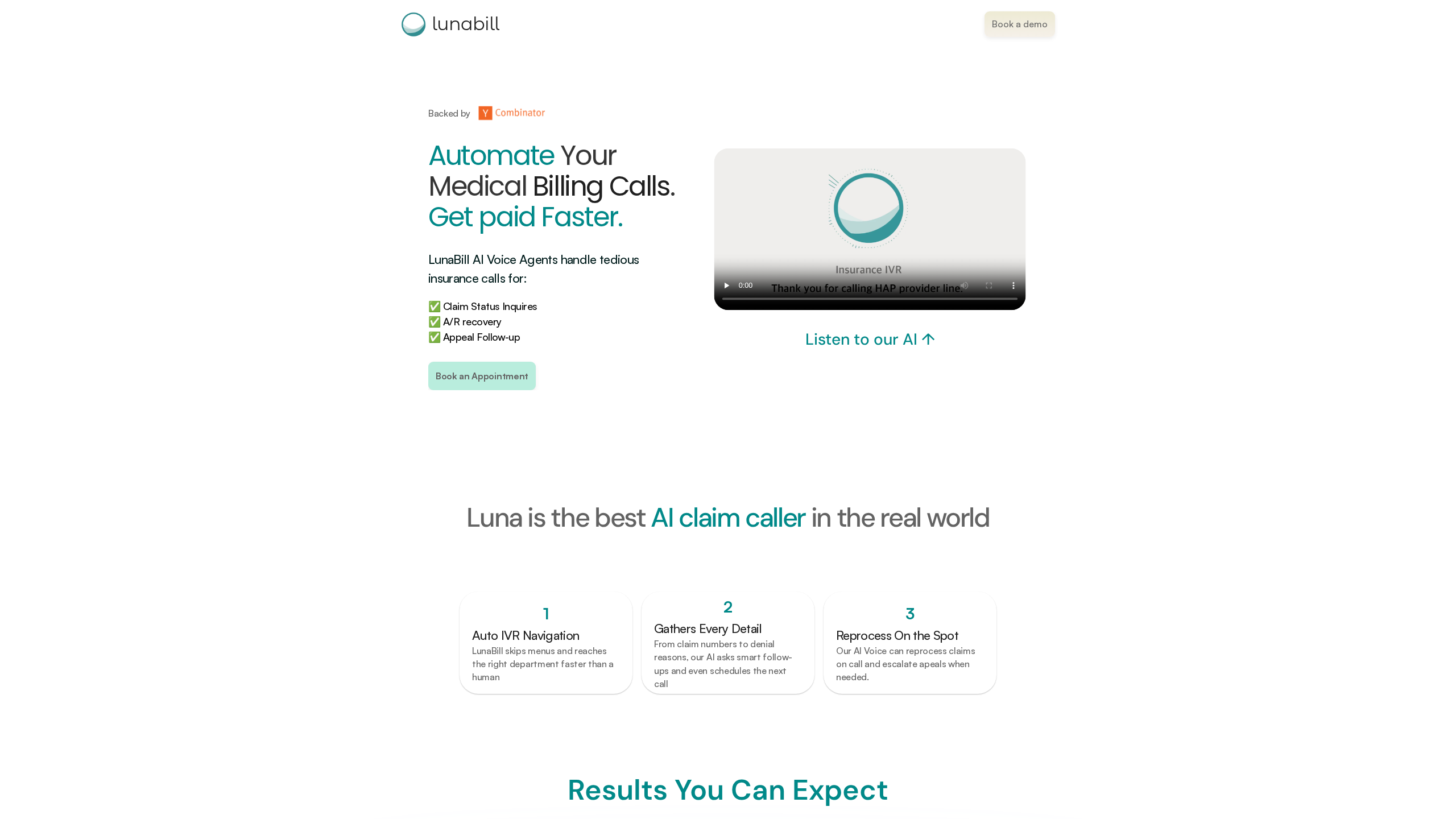 LunaBill provides AI Voice Agents that handle tedious insurance calls to help you get paid faster. The agents are designed to manage claim status inquiries, A/R recovery, and appeal follow-ups.