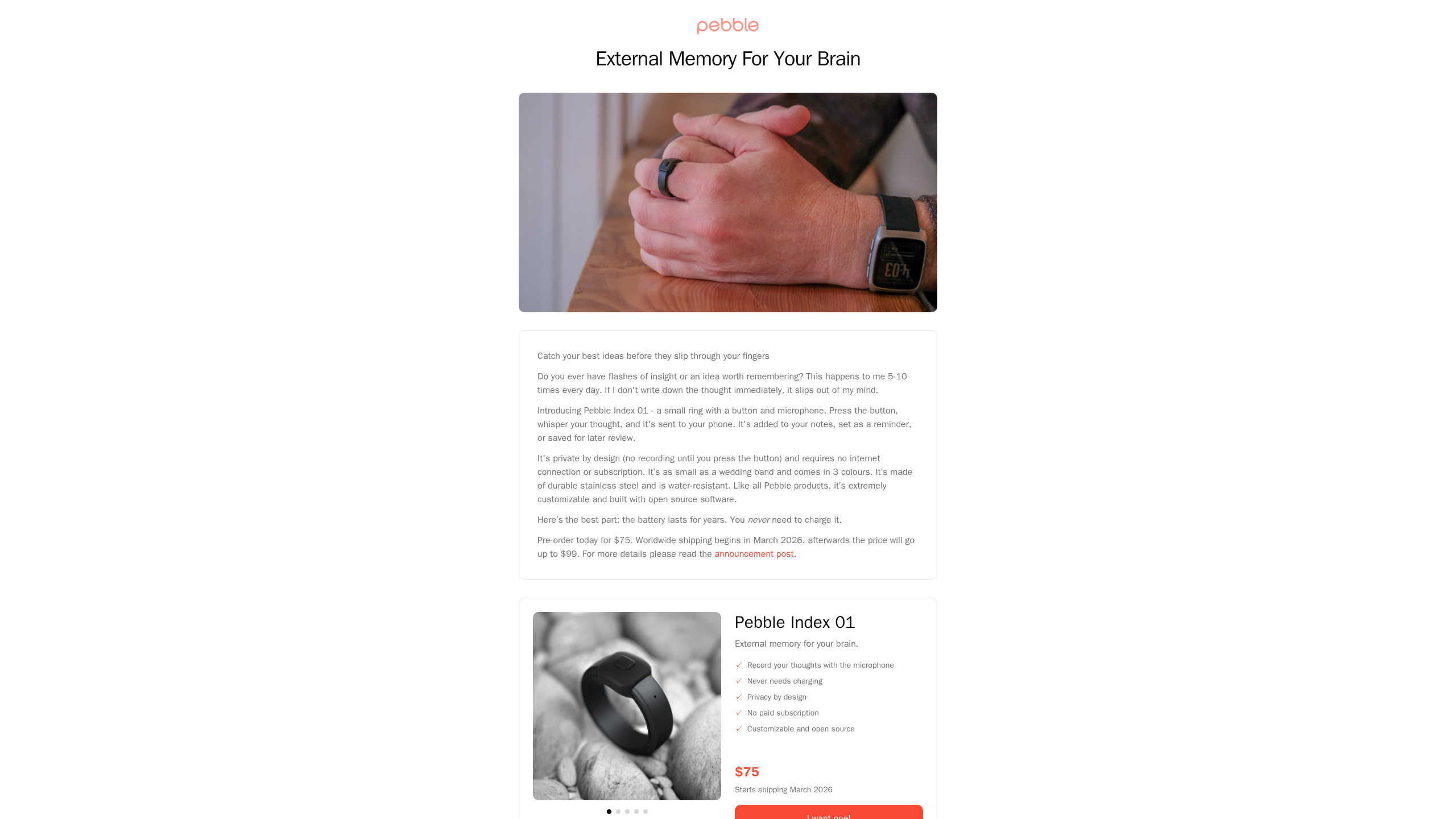 Pebble Index 01 is a small ring with a button and microphone designed to capture ideas and thoughts. When the user presses the button and speaks, the thought is recorded and sent to their phone. The recording is then processed on the device to be added to notes or set as a reminder. The device is private by design, requires no internet connection or subscription, and has a battery that lasts for years without needing to be charged.