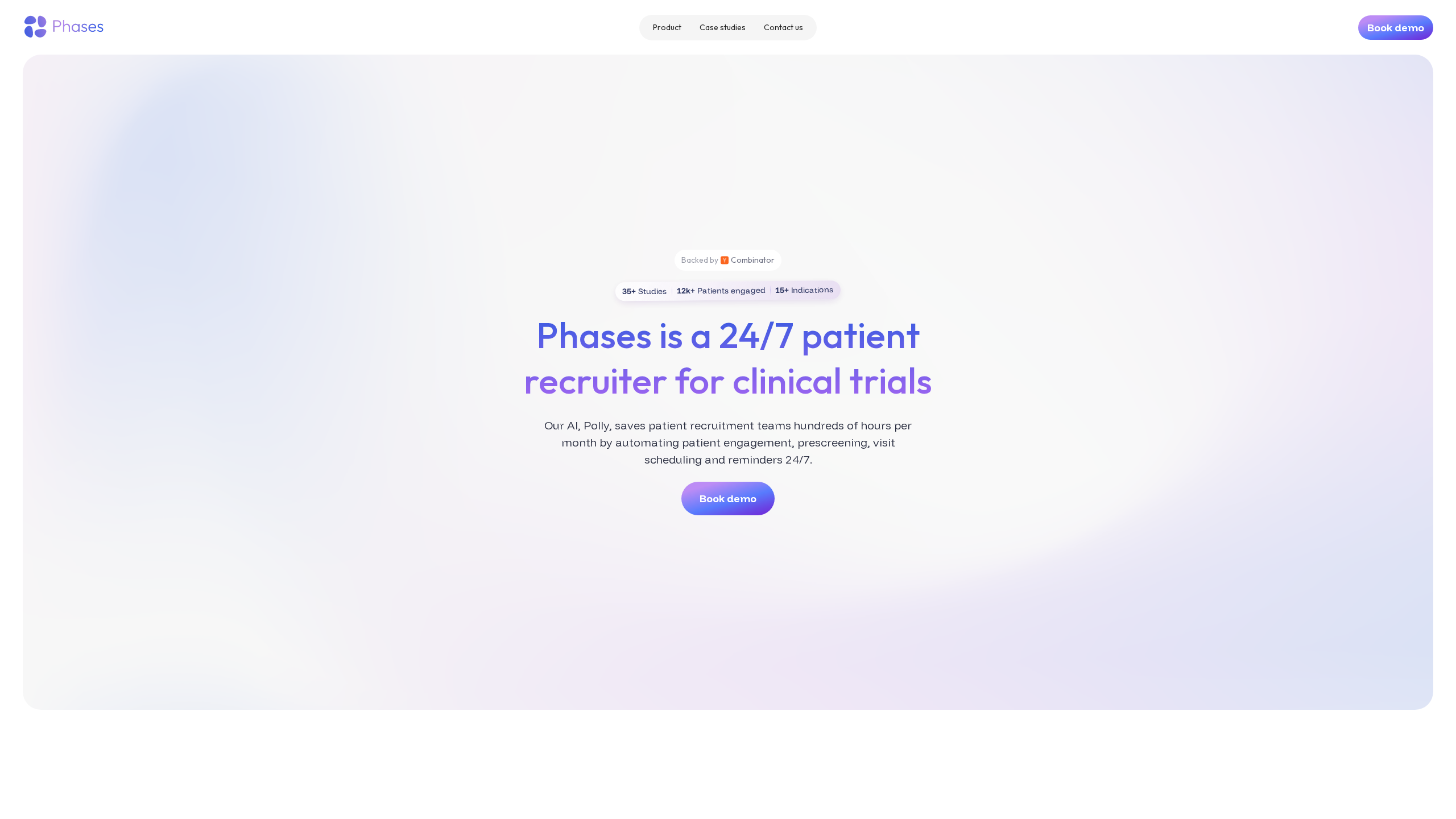 Phases is a 24/7 AI patient recruiter for clinical trials. Its AI, Polly, saves patient recruitment teams hundreds of hours per month by automating patient engagement, prescreening, visit scheduling, and reminders. The platform has been used in over 35 studies, engaging more than 12,000 patients.