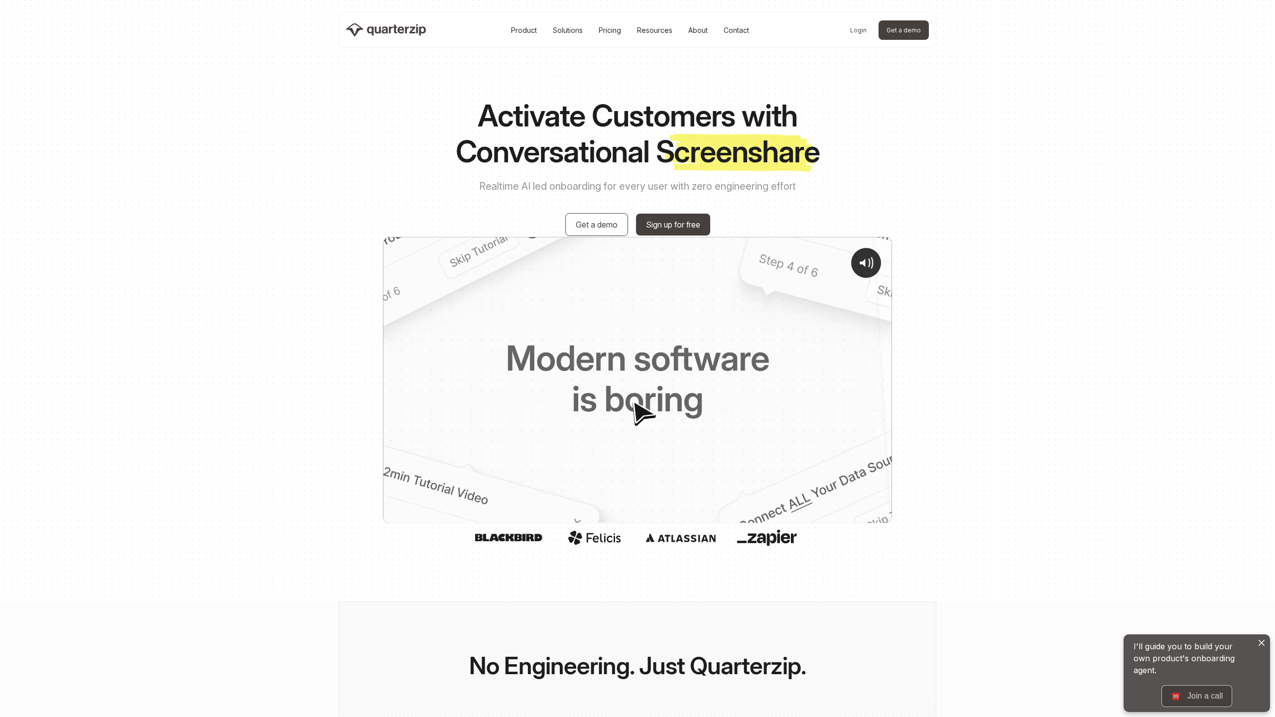 - Integration: Connect Quarterzip to your product, allow the AI to ingest your workflows, and go live with continuous guidance from day one.