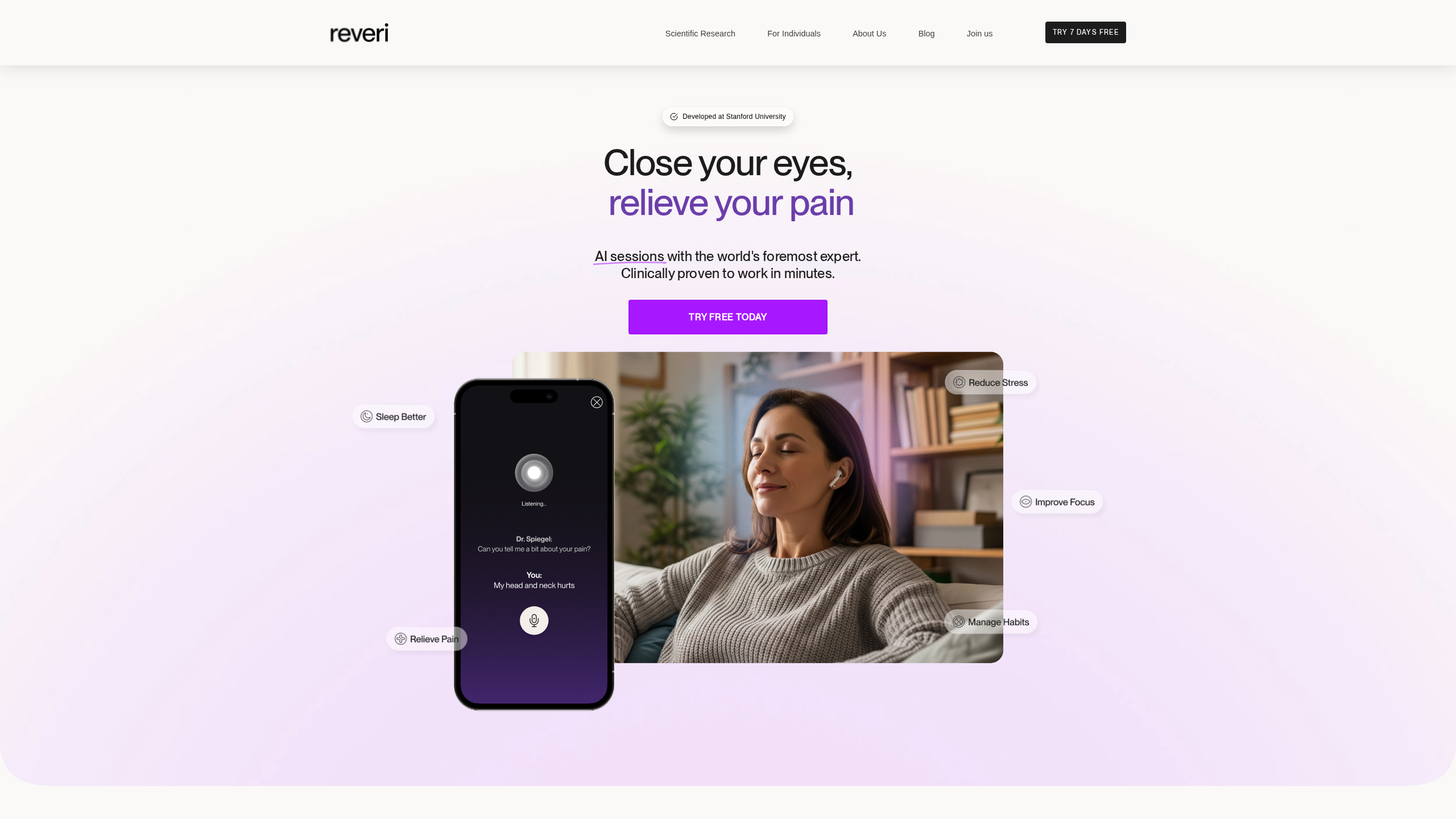 Developed at Stanford University, Reveri is an AI-powered app providing self-hypnosis and guided hypnotherapy sessions. The app is clinically proven to work in minutes and is designed to help users relieve pain, reduce stress, and improve sleep. It is backed by over 45 years of research and has been used by millions of people.